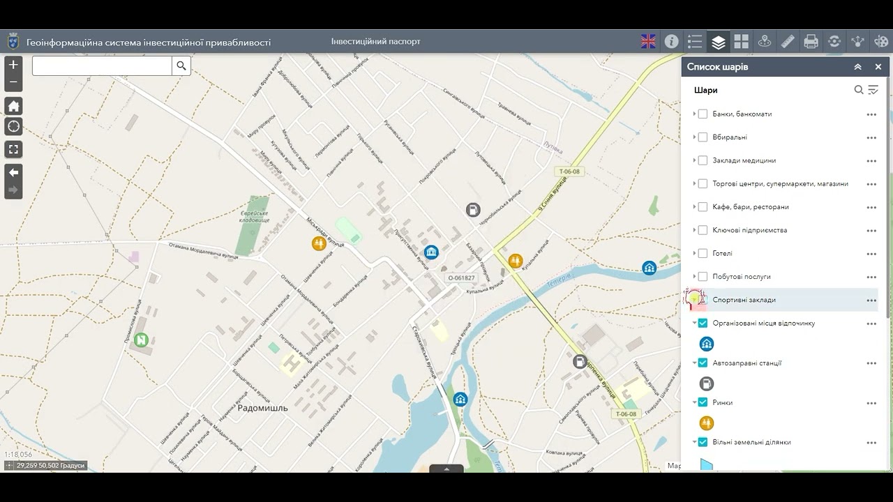 Геоінформаційна система Радомишльської громади – це картографічний ресурс призначений для зберігання, накопичення та відображення у вигляді інтерактивної карти інформації про об’єкти туристичної та інвестиційної інфраструктури. ГІС дає змогу інвесторам із будь-якого куточка світу оглянути наявний інвестиційний потенціал громади, оцінити його можливості та конкурентні переваги.